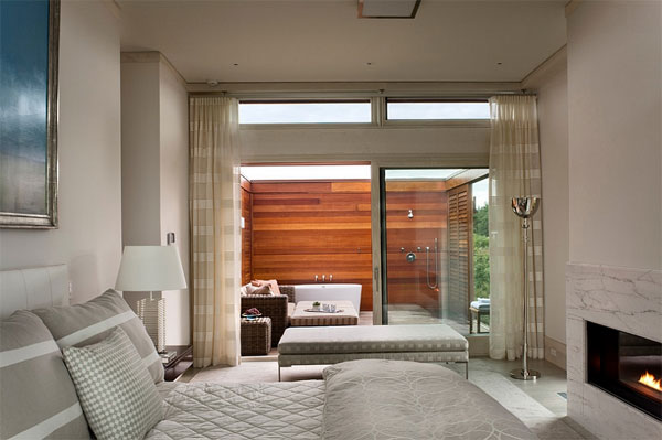 ห้องนอนสีเบจสุดหรูที่เชื่อมต่อกับห้องน้ำกลางแจ้งด้านนอกด้วยกระจกใสบานใหญ่