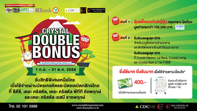 คริสตัล ดีไซน์ เซ็นเตอร์ (ซีดีซี) และ เดอะ คริสตัล จับมือ ธนาคารกสิกรไทย จำกัด (มหาชน) จัดบิ๊กแคมเปญ "CRYSTAL DOUBLE BONUS" (คริสตัล ดับเบิ้ล โบนัส) ยิ่งใช้มาก ยิ่งรับมา เอาใจขาช้อปมอบสิทธิพิเศษเหนือใคร เมื่อใช้จ่ายผ่านบัตรเครดิต และบัตรเดบิตกสิกรไทย ที่ร้านค้าร้านอาหารใน โครงการคริสตัล ดีไซน์ เซ็นเตอร์ (ซีดีซี), เดอะ คริสตัล เลียบทางด่วนเอกมัย-รามอินทรา, เดอะ คริสตัล พีทีที ชัยพฤกษ์ และ เดอะ คริสตัล เอสบี ราชพฤกษ์