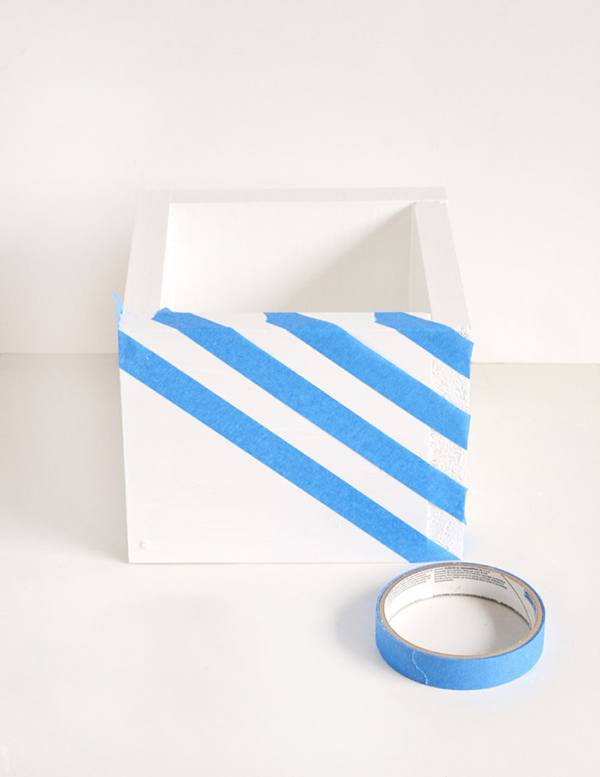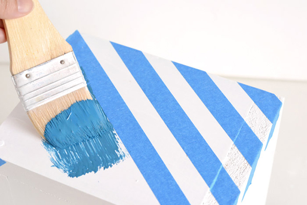 5. ใช้เทปกาวที่สามารถลอกออกได้ง่ายเพื่อสร้างลวดลายค่ะ เราจะทาสีลงไปอีกรอบนะคะ (สีฟ้า) และเมื่อลอกเทปกาวออกก็จะเป็นลายสีขาวที่เป็นสีพื้นเดิมค่ะ อยากได้ลายอะไรแปะได้ตามใจชอบเลยค่ะ