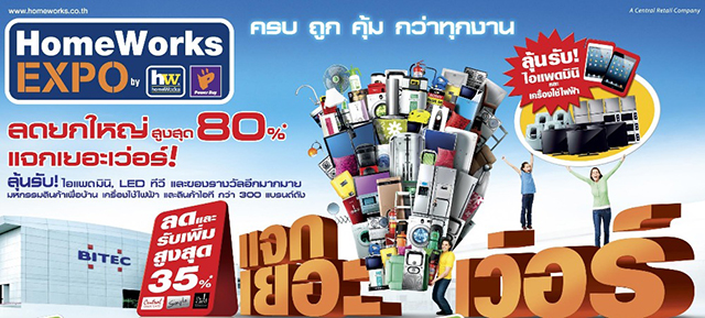 เตรียมพบกับปรากฎการณ์ความเป็น "ที่สุด" แห่งปี กับงาน HomeWorks Expo 2015 ครั้งที่ 19 ลดราคาสินค้าเพื่อบ้าน เครื่องใช้ไฟฟ้า และสินค้าไอที พร้อมผนึกกำลังพันธมิตรในเครือเซ็นทรัล ได้แก่ โฮมเวิร์ค ศูนย์รวมสินค้าตกแต่ง ซ่อมแซมบ้าน และอุปกรณ์ก่อสร้าง ครบวงจร, เพาเวอร์บาย ศูนย์รวมเครื่องใช้ไฟฟ้า สินค้าไอที อุปกรณ์อิเล็กทรอนิกส์ครบวงจร, เซ็นทรัล มาร์เก็ตติ้ง กรุ๊ป ผู้ผลิตและนำเข้าสินค้าแฟชั่นแบรนด์เนม และท็อปส์ ซูเปอร์มาเก็ตระดับนานาชาติ งานเดียวที่รวมทั้งสินค้าตกแต่ง - ซ่อมแซมบ้าน, อุปกรณ์ก่อสร้าง, เครื่องใช้ไฟฟ้า, สินค้าไอที, อุปกรณ์อิเล็กทรอนิกส์, สินค้าแฟชั่น เสื้อผ้า, รองเท้า, เครื่องสำอาง, สินค้าอุปโภคบริโภค และอื่นๆ อีกมากมายกว่า 300 แบรนด์ดัง ลดยกใหญ่ สูงสุด 80% ตั้งแต่วันที่ 2 - 11 ตุลาคม 2558 ที่ไบเทค บางนา
