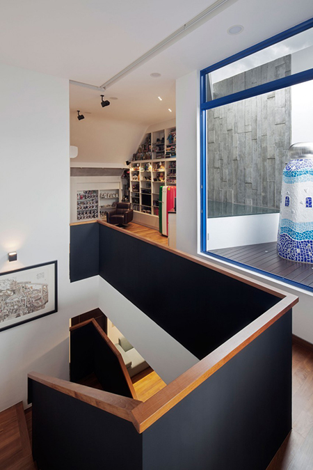 มุมเฉียงตรงระเบียงนั้น ด้านบนเปิดเป็นช่องไว้เพื่อรับแสงจากธรรมชาติค่ะ เจาะหน้าต่างสำหรับสูดอากาศเบาๆ เวลาฝนตกยื่นมือออกมาสัมผัสน้ำฝนได้เลย ตามกำแพงของส่วนนี้ปลูกพันธุ์ไม้เลื้อยเพิ่มความเขียว