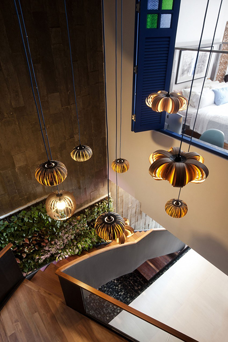 บริเวณบันไดจะเชื่อมถึงกันหมด ทำให้มองเห็นตั้งแต่ชั้นบนถึงชั้นล่างเลย ติดโคมไฟระย้ายาวๆ ก็สวยไปอีกแบบค่ะ