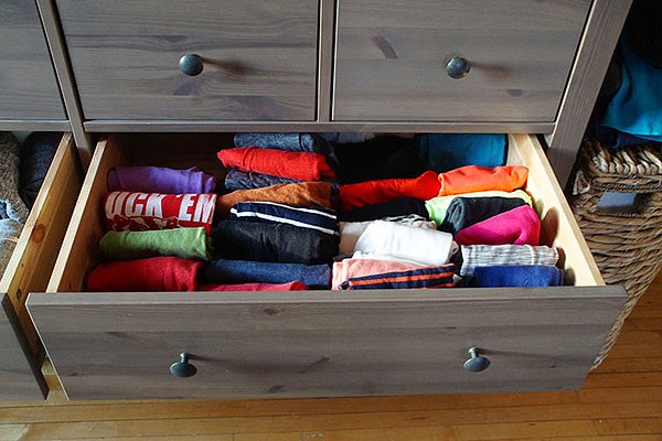 5. จัดเก็บเสื้อผ้าที่คัดแล้วให้เข้าที่อย่างเป็นระเบียบ โดยคิดกับเสื้อผ้าเหมือนเป็นสิ่งมีชีวิตที่ไม่ชอบแน่หากถูกพับเก็บแบบอัดๆ ซ้อนๆ กัน (คิดแบบนี้จะทำให้คุณไม่ยัดเก็บเสื้อผ้า เพราะยากแก่การหยิบใช้งานแล้วในที่สุดก็จะกลับมารกอีก)