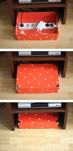 ใช้กล่องใส่พวกเครื่องใช้ไฟฟ้าที่มีสายไฟรุงรังให้เป็นระเบียบ แล้วเจาะรูด้านหลังเพื่อปล่อยสายที่จำเป็น