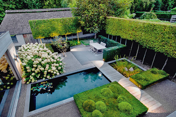 เก๋ๆ ด้วยแนวกำแพงต้นไม้ และเติมความสดชื่นด้วยบ่อน้ำเล็กๆ
