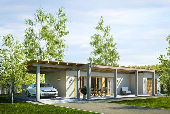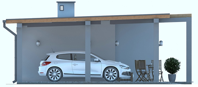 พื้นที่บ้านเป็นรูปทรงสี่เหลี่ยมผืนผ้า ฝั่งซ้ายและขวาจะเป็นที่จอดรถ ทั้งแบบ indoor และ outdoor (โรงรถส่วน indoor นั้นสามารถเปลี่ยนเป็นพื้นที่่ใช้สอยอื่นๆ ได้) หน้าบ้านมีชานบ้านเล็กๆ พอที่จะวางโต๊ะเอาไว้นั่งพักผ่อนรับลมได้ บริเวณชานบ้านแต่งหลังคาเท่ๆ ทำด้วยระแนงไม้สีอ่อน ทำให้รับแสงแดดที่ส่องลงมาได้