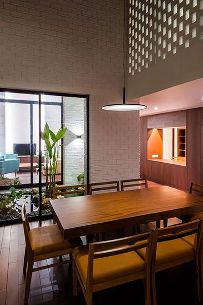 สำหรับการตกแต่งภายในบ้าน เน้นความสูงของกระจกเพื่อรับแสงรับแดดจากธรรมชาติแบบเต็มๆ ส่วนสีที่เลือกใช้ ก็ยังเน้นโทนธรรมชาติ ได้แก่ สีโทนเนื้อไม้เข้มตัดกับกำแพงอิฐสีขาว ดึงสายตาด้วยโซฟาสีเขียว