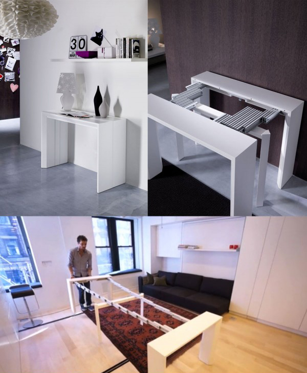 โต๊ะวางของติดผนังตามปกติ แต่ดีไซน์ให้สามารถยืดขยายจนกลายเป็นโต๊ะกินข้าวยาวถึง 8 ที่นั่ง
