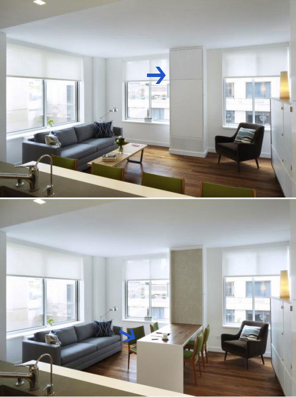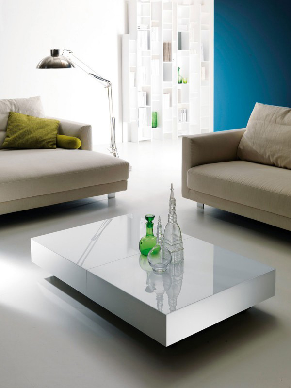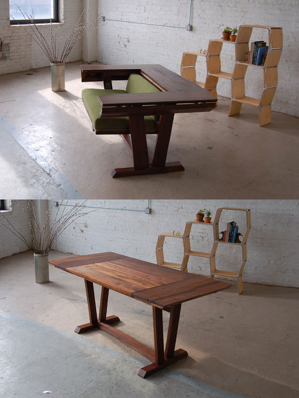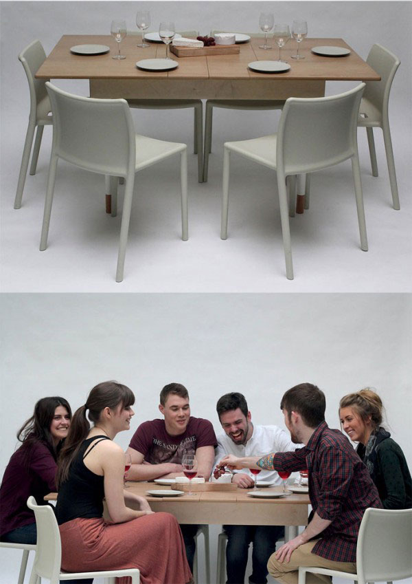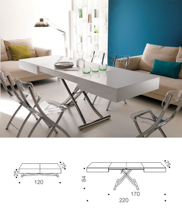 โต๊ะกลางเข้าชุดในห้องรับแขกธรรมดา ออกแบบให้สามารถยกขาและปรับขยายความยาวจนกลายเป็นโต๊ะกินข้าวหรูได้