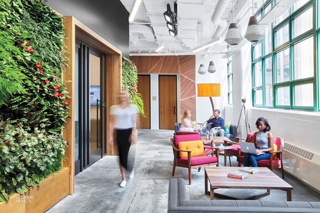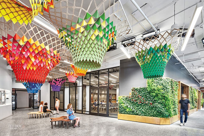 มุมพักผ่อนเบาๆ ของ Etsy headquarters กับกำแพงไม้วอลนัทสุดเท่ แปะด้วยไม้เลื้อยนานาพันธุ์ บนเพดานยังมีงานคราฟท์เจ๋งๆ เพิ่มความสดใสให้กับออฟฟิศด้วย