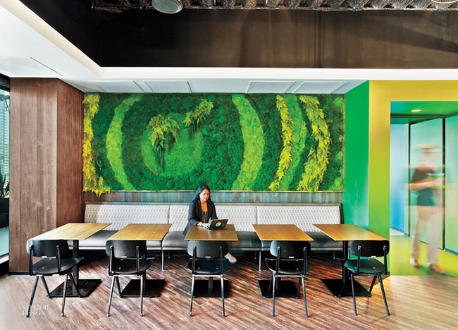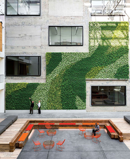 ออฟฟิศสีเขียวของ LinkedIn ในซานฟรานซิสโก ผนังออฟฟิศบุด้วยมอสสีเขียวหลากชนิด เรียกว่าทำงานท่ามกลางธรรมชาติเลยล่ะค่ะ