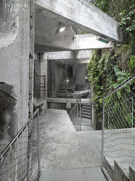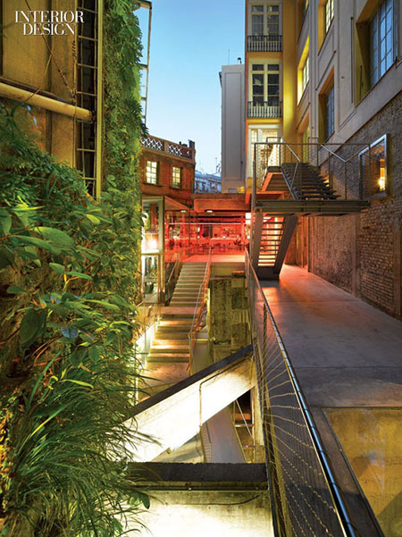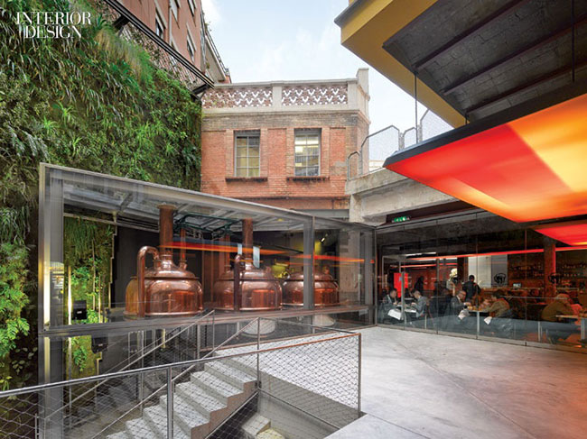 ออฟฟิศแห่งเบียร์อย่าง Cervezas Moritz Brewery ตกแต่งดิบๆ กำแพงปูนเปลือยและรั้วเหล็กแมนๆ กับต้นไม้เขียวยืนต้น ที่ไม้ได้เน้นแค่มอสหรือไม้เลื้อย ภายใต้การผสมผสานระหว่างธรรมชาติ+อุตสาหกรรม+การผลิตเบียร์