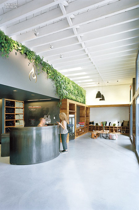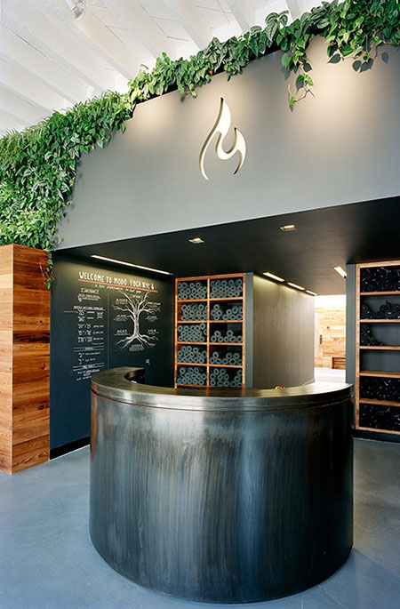 Reception ที่ตกแต่งด้วยเถาวัลย์และบรรดาไม้เลื้อยของ Modo Yoga ต้นไม้สีเขียวตัดกับเคาน์เตอร์สีเข้มๆ จากกำแพงธรรมดาเติมลูกเล่นของธรรมชาติเข้าไป ดูดีไม่น้อยใช่มั้ยคะ...
