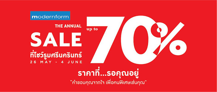 มหกรรมลดราคาครั้งใหญ่ที่สุดในรอบปี 2017 พบกับเฟอร์นิเจอร์หลากสไตล์ จากโมเดิร์นฟอร์ม พร้อมส่วนลดพิเศษสูงสุดถึง 70% !!!แล้วพบกัน 26 พฤษภาคม - 4 มิถุนายน 2560 ที่ โชว์รูม Modernform ศรีนครินทร์ เท่านั้น !!!