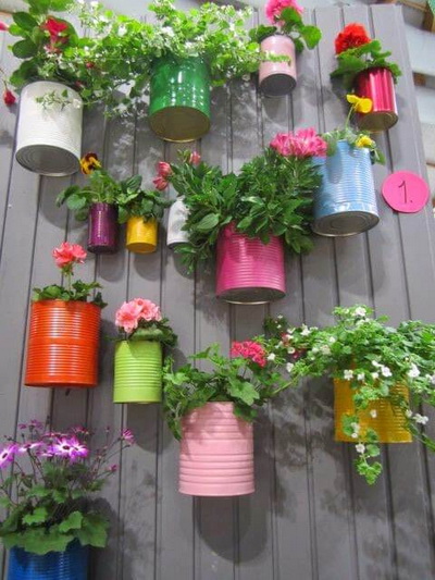 ทาสีกระป๋องให้สวย แล้วนำมาทำเป็นกระถางต้นไม้ แขวนติดกับกำแพง ดูสดใสทีเดียวค่ะ