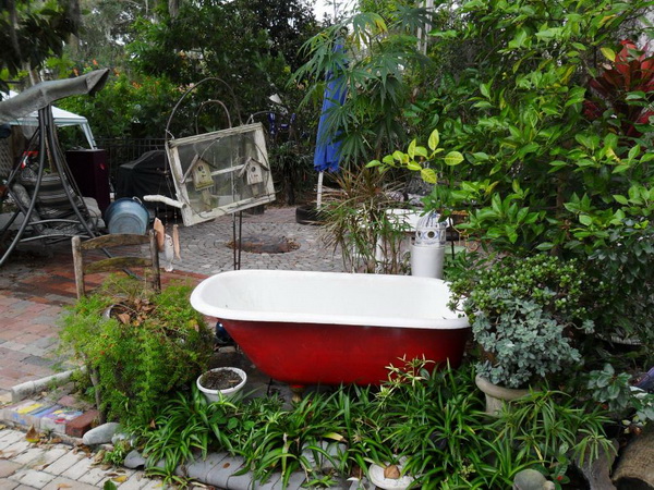 อ่างอาบน้ำที่ไม่ใช้แล้ว เอามาทาสีแดงให้ตัดกับสีเขียวของสวน เพิ่มมิติให้กับสวนของคุณมากขึ้น