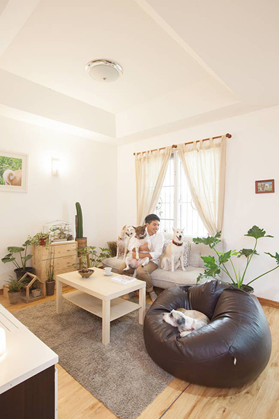 ภายในบ้านแบ่งออกเป็นมุมต่างๆ ที่เชื่อมต่อกันทั้งหมด ทำให้ชั้นล่างมีพื้นที่กว้างขวางพอให้แก๊งสี่ขาวิ่งเล่นกันได้สบายๆ "โซฟาจะเป็นมุมประจำของนวล กลูต้าจะมีกระโจมที่เขาชอบนอนประจำ ลูกชิ้นจะชอบนอนที่บีนแบ็ก ส่วนกอลลั่มจะชอบนอนใต้โต๊ะ ใต้ตู้ ถ้าแบ่งชั้นวรรณะกอลลั่มจะอยู่ต่ำสุด (หัวเราะ) ส่วน นวลเจ้าหมาหน้า 7-11 ได้ลืมกำพืดตัวเองไปแล้วเรียบร้อย ผมเคยพาเขากลับไปที่ 7-11 เดิมที่เขาเคยอยู่ นวลนั่งเฉยเหมือนไม่เคยรู้จักที่นี่มาก่อน (หัวเราะ) โชคดีที่เป็นสุนัขพันทางเลยจะไม่ค่อยมีปัญหาเรื่องขนและกลิ่น ซึ่งจริงๆ เราแทบไม่ได้ทำอะไรเลย แค่ทำความสะอาดบ้านตามปกติ"