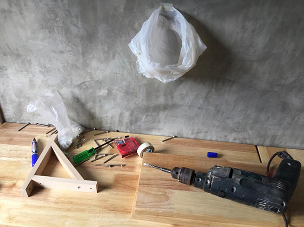 ขั้นตอนที่ 8 ต่อมาก็สั่งทำโต๊ะเป็นงานไม้ผสมเหล็ก แล้วก็ท็อปสำหรับติดผนังและที่ยึดซื้อที่ IKEA