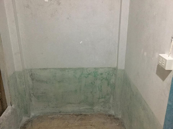 เดิมมีสภาพเป็นผนังขาว ครึ่งล่างทาสีน้ำมันทับไว้ 2 ชั้น ทั้งห้อง มีสายไฟและกล่องปลั๊กสภาพเก่ามาก