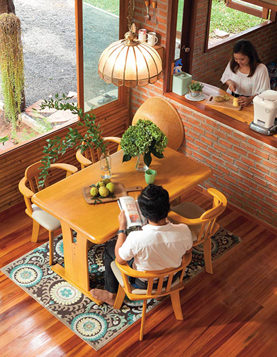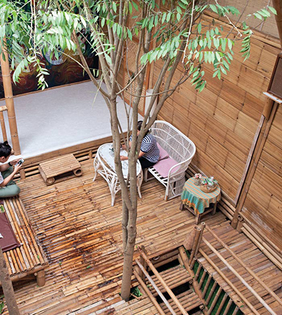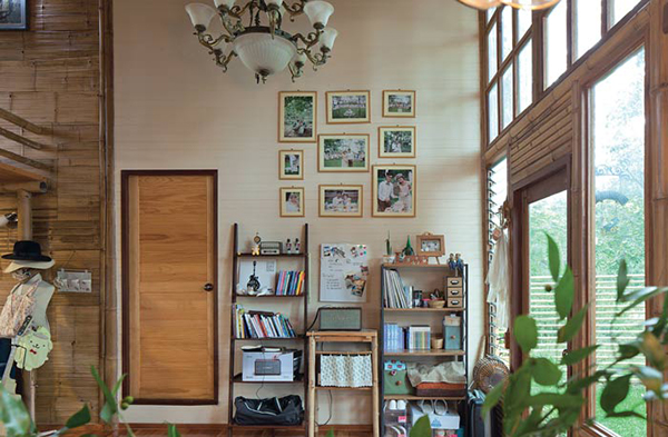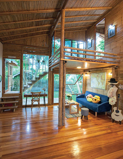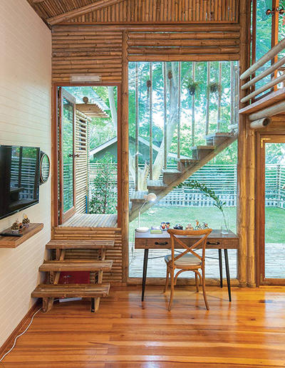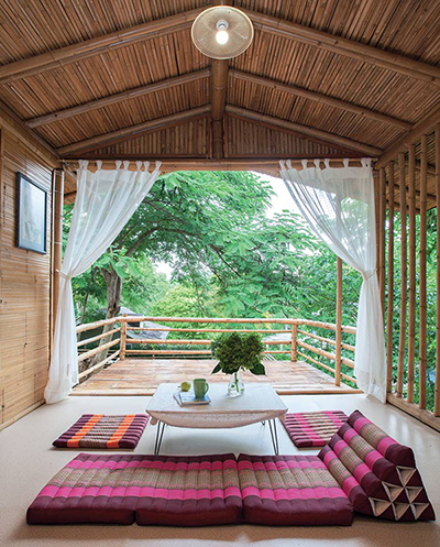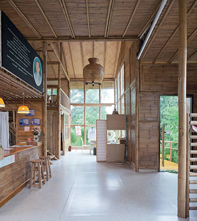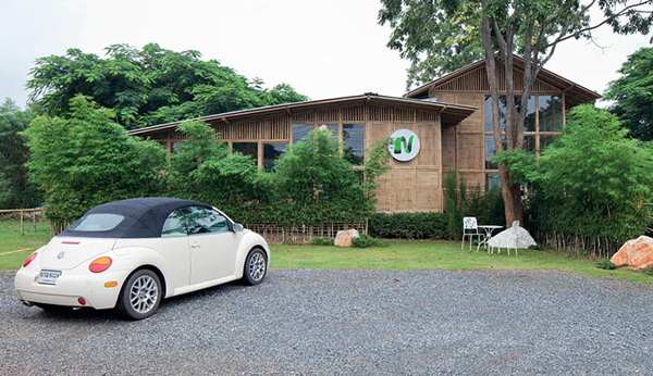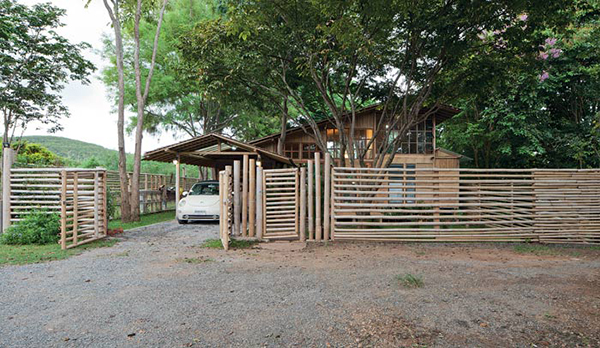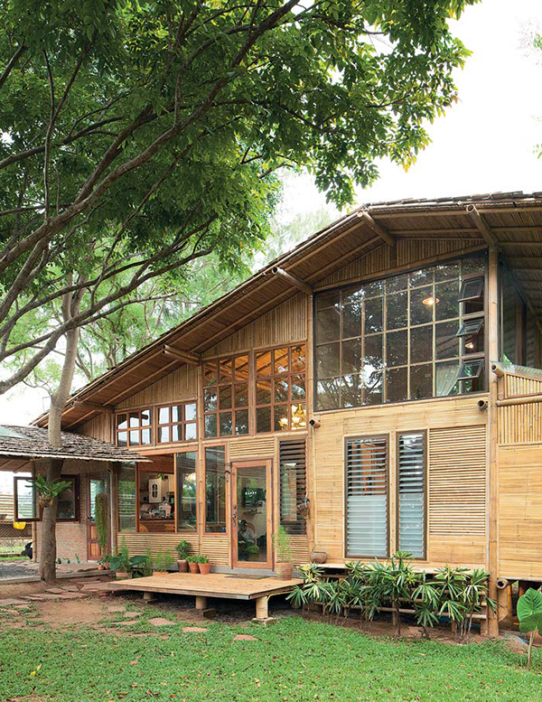 ไผ่ที่เลือกใช้คละกันหลายชนิด อย่างโครงสร้างเสา คาน เลือกใช้ไผ่ตงและไผ่ซางหม่นที่มีลำขนาดใหญ่ ส่วนรายละเอียดอื่นๆ อย่างหลังคา ฝ้า ผนัง เลือกใช้ไผ่เลี้ยง ซึ่งมีลักษณะลำเล็กกว่าไผ่ตงและไผ่ซางหม่น บวกกับการผสมผสานวัสดุสมัยใหม่ เพื่อให้สอดคล้องกับวิถีปัจจุบันเสน่ห์ของบ้านหลังนี้ไม่ได้มีเพียงวัสดุที่เลือกใช้ แต่ยังรวมถึงฟังก์ชันและพื้นที่การใช้งาน โดยยกพื้นสูงขึ้นเล็กน้อยตามแนวพื้นที่ และเพื่อลดปัญหาความชื้นจากดินในขณะเดียวกันก็ช่วยให้อากาศถ่ายเท พร้อมกับมีหลังคาทรงจั่ว ชายคายื่นยาวตามสไตล์บ้านไทย หากแต่ไม่ธรรมดาด้วยการดีไซน์ผนังกรุไม้ไผ่เป็นระแนงทั้งแนวตั้งและแนวนอนสลับกับหน้าต่างและช่องแสงคละกันไป ทำหน้าที่คอยรับลม สร้างให้บ้านมีสภาวะน่าอยู่