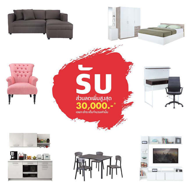 รับส่วนลดเพิ่มสูงสุด 30,000.-* เฉพาะชำระเต็มจำนวนเท่านั้น เมื่อช้อปเฟอร์นิเจอร์ INDEX, KITCHEN, BUILT-IN, BATHROOM FURNITURE, WINNER, LOGICA, SERTA, THERAFLEX ครบตามที่กำหนด