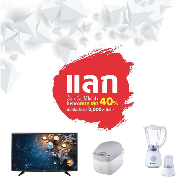 แลกซื้อเครื่องใช้ไฟฟ้า ในราคาลดสูงสุด 40% เมื่อช้อปครบ 2,000.- ขึ้นไป*