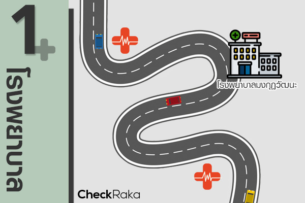โรงพยาบาลมงกุฎวัฒนะ ตั้งอยู่บนถนนแจ้งวัฒนะใกล้กับบิ๊กซี แจ้งวัฒนะ ในบริเวณสี่เหลี่ยมทำเลน่าอยู่จะมีเพียง 1 โรงพยาบาลที่ใกล้ที่สุด แต่พื้นที่โดยรอบจะมีทั้งโรงพยาบาลจุฬาภรณ์ โรงพยาบาลวิภาวดี โรงพยาบาลวิภาราม-ปากเกร็ดเป็นต้น