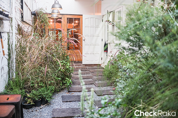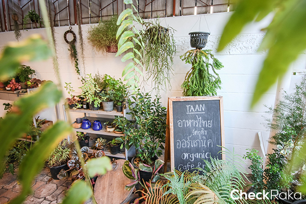 ด้านหน้าร้านตกแต่งด้วยต้นไม้ ร่มรื่นและสวยงาม