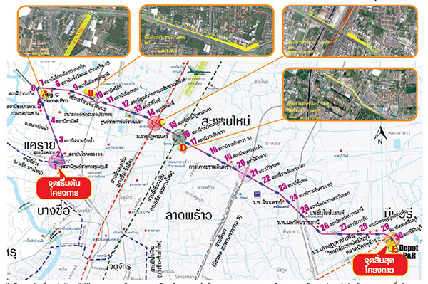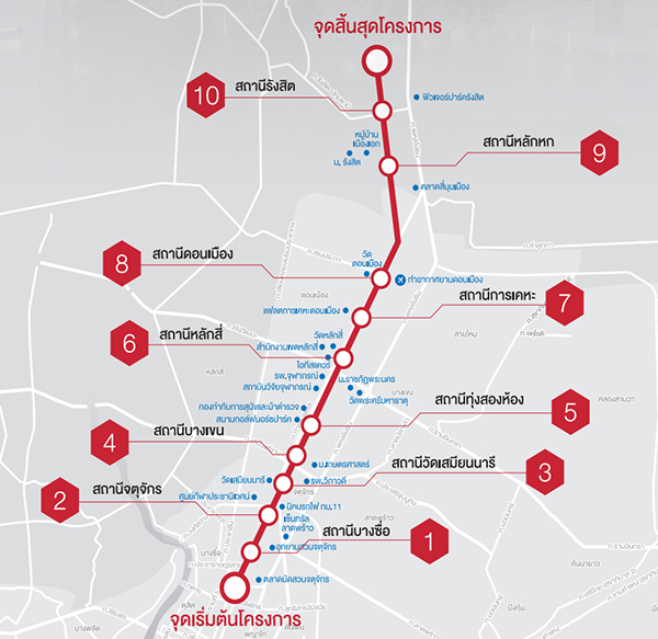 - สถานีดอนเมือง ตั้งอยู่ตรงข้ามอาคารผู้โดยสารท่าอากาศยานดอนเมือง ใกล้สถานีรถไฟดอนเมืองปัจจุบัน