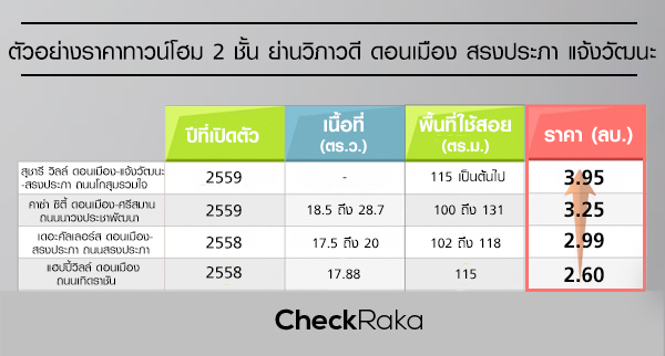 ทำเลที่เป็นที่นิยมอย่างวิภาวดี ดอนเมือง สรงประภา แจ้งวัฒนะ ก็จะมีโครงการเปิดตัวใหม่ขึ้นมาเรื่อยๆ ในทุกๆ ปี ในละแวกนี้จะมีทั้งบ้านเดี่ยว บ้านแฝด ทาวโฮม 4 ชั้น 3 ชั้น ซึ่งในครั้งนี้เราจะขอนำตัวอย่างราคาโครงการทาวน์โฮม 2 ชั้น มาให้ได้ดูกันค่ะว่า ในแต่ละปีนั้นราคาเปิดตัวอยู่ที่เท่าไหร่