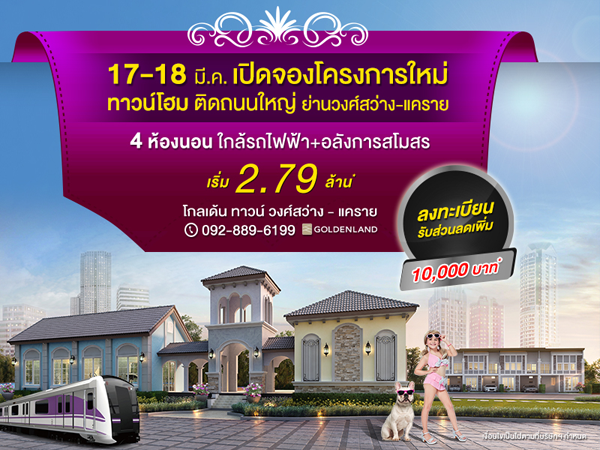 โกลเด้น ทาวน์ วงศ์สว่าง-แคราย ทาวน์โฮม 2 ชั้น 4 ห้องนอน 2 ที่จอดรถ มีฟิตเนส + สโมสร ราคาเริ่มต้นที่ 2.79 ล้านบาท* และถ้าลงทะเบียนออนไลน์ จะได้รับส่วนลดเพิ่ม 10,000 บาท อีกด้วยค่ะ