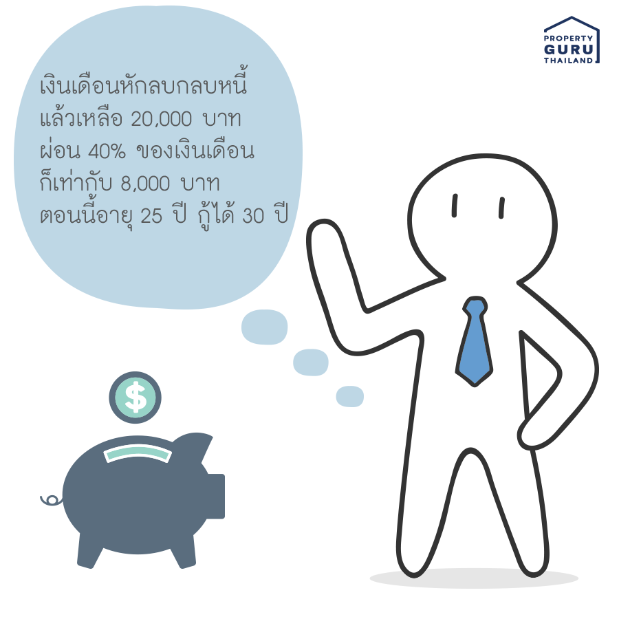 หลักการกู้ทั่วไปของธนาคารจะพิจารณาความสามารถในการผ่อนชำระของผู้กู้อยู่ที่ 40% ของรายได้ หรือประมาณ 15 - 25% ของรายได้ต่อเดือนหลังหักค่าใช้จ่ายส่วนตัว ยกตัวอย่างเช่น ผู้กู้มีรายได้ 20,000 บาท และไม่มีภาระค่าใช้จ่ายเพิ่มเติม ความสามารถในการผ่อนชำระ 40% ของเงินเดือนผู้กู้อยู่ที่ 8,000 บาท เป็นต้น ถึงแม้ว่าเกณฑ์มาตรฐานที่ธนาคารจะรับพิจารณาจะเป็นแบบในตารางข้างต้น แต่ในความเป็นจริงแล้วก็ยังขึ้นอยู่กับปัจจัยหลายๆ อย่างของทั้งตัวผู้กู้ เช่น อาชีพ, อายุ, ความมั่นคงของสถานที่ทำงาน การกู้ร่วม เป็นต้น และขึ้นอยู่กับโปรโมชั่นของโครงการ ณ ตอนนั้นด้วยเช่นกัน
