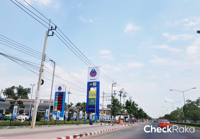 ปั๊มน้ำมัน PTT ตั้งอยู่บนถนนเทพรักษ์