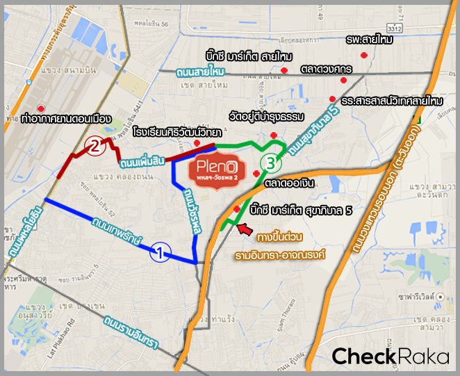 การเดินทางไปยังโครงการ Pleno พหลโยธิน-วัชรพล 2 สามารถไปได้ 3 เส้นทางหลักด้วยกัน โดยผ่านถนนต่างๆ ไล่เรียงตามลำดับดังนี้