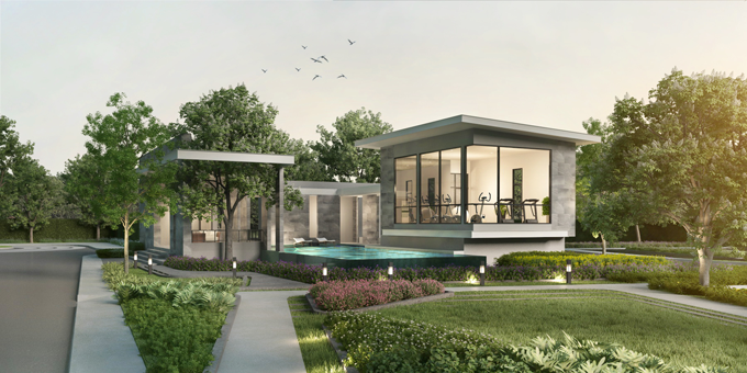 ภาพจำลองคลับเฮ้าส์ พร้อมสระว่ายน้ำ และฟิตเนส Panorama View อยู่ท่ามกลางสวนสีเขียวขนาดใหญ่