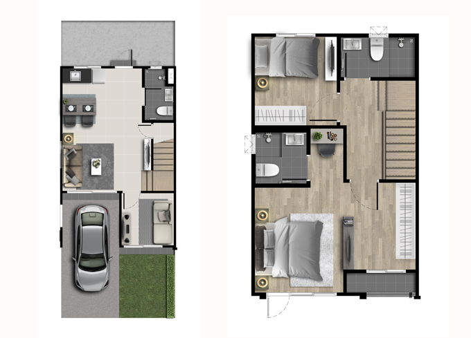ทาวน์โฮม 2 ชั้น - หน้ากว้าง 5 เมตร ที่ดินเริ่มต้น 16.4 ตร.ว. พื้นที่ใช้สอย 91.16 ตร.ม. ขนาด 2 ห้องนอน 3 ห้องน้ำ 1 ห้องอเนกประสงค์ ที่จอดรถ 1 คัน