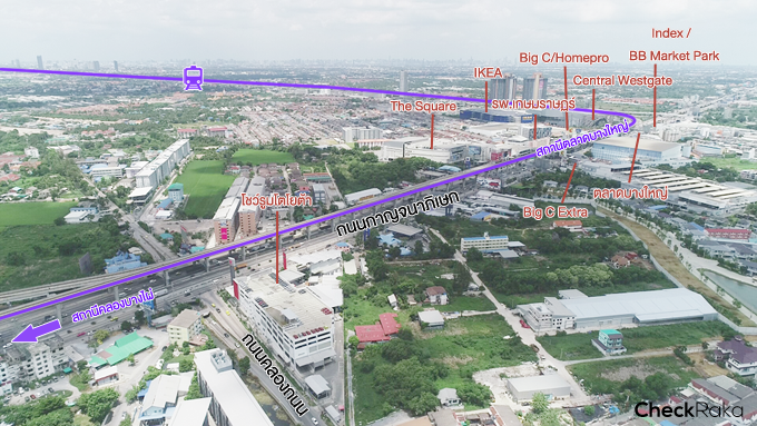 ภาพมุมสูงแสดงให้เห็นรถไฟฟ้าสายสีม่วง ถนนกาญจนาภิเษก และถนนคลองถนนที่ใช้เป็นถนนทางเข้าโครงการ