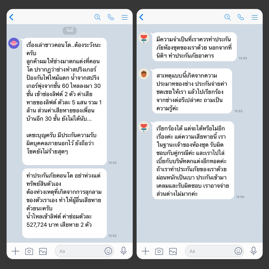 มีเรื่องเล่าจากชาวคอนโดแห่งหนึ่งที่มีเหตุการณ์ไม่คาดฝันเกิดขึ้น โดยช่างที่มาตกแต่งคอนโดเป็นช่างข้างนอก แล้วเกิดอุบัติเหตุไปทำให้สปริงเกอร์ดับเพลิงของห้องแตก ทำให้น้ำภายในสปริงเกอร์พุ่งออกมา น้ำเจิ่งนองไปทั่วห้องไม่พอ ยังไหลลงไปด้านล่างถึง 30 ชั้น อีกทั้งยังส่งผลให้ลิฟต์โดยสายเสียหายเป็นมูลค่ากว่า 1 ล้านบาท เหตุการณ์แบบนี้อาจจะไม่ได้เกิดขึ้นบ่อย แต่ก็เป็นสิ่งที่เราคาดไม่ถึง การทำประกันไว้ก็เป็นสิ่งที่จะทำให้เราเกิดความอุ่นใจได้ในระดับหนึ่งค่ะ