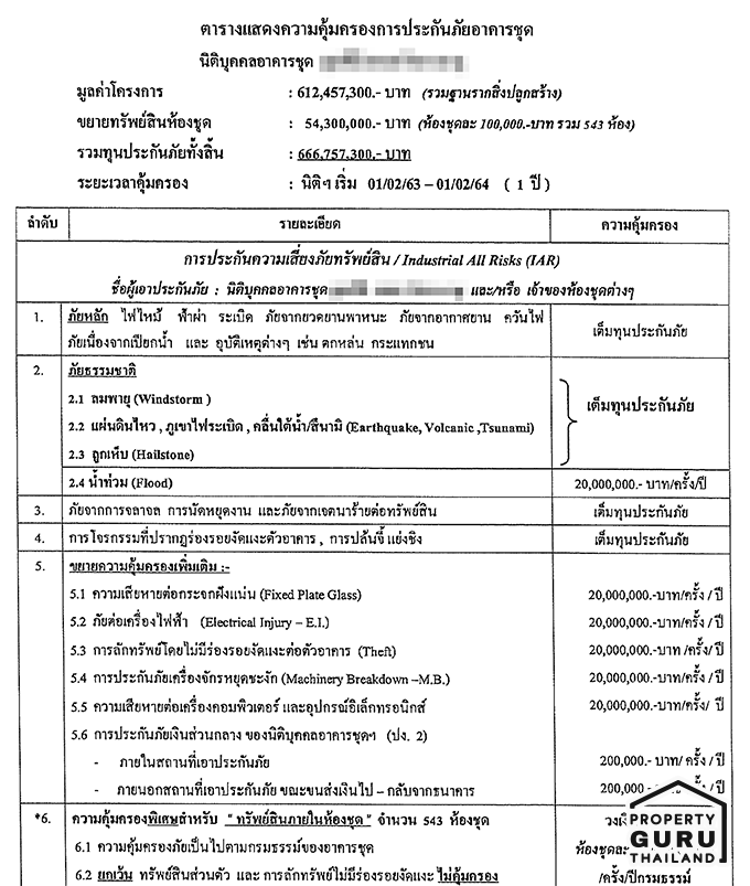 ตัวอย่างเอกสารแสดงความคุ้มครองประกันภัยอาคารชุดของโครงการแห่งหนึ่ง
