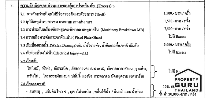 | ภัยจากน้ำ ที่เกิดจากรั่ว ไหล หรือล้นมาจากท่อน้ำ ถังน้ำ เป็นต้น | * ภัยธรรมชาติ ชดเชยความเสียหายตามจริง แต่ไม่เกิน 20,000 บาท ต่อภัยธรรมชาติทั้งหมดใน 1 ปี |