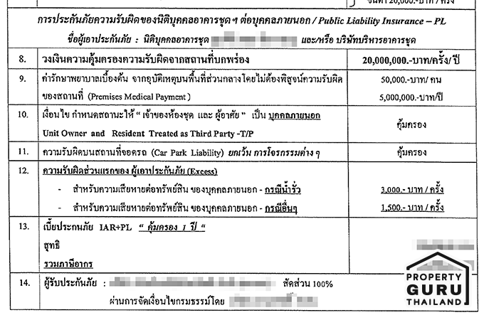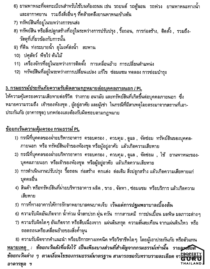 | ทรัพย์สินส่วนกลางทุกชนิด | คุ้มครองบุคคลภายนอก เมื่อเกิดอะไรขึ้นกับบุคคลภายนอก ในพื้นที่ส่วนกลาง บางเจ้าครอบคลุมไปถึงการถูกโจรกรรมด้วย