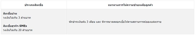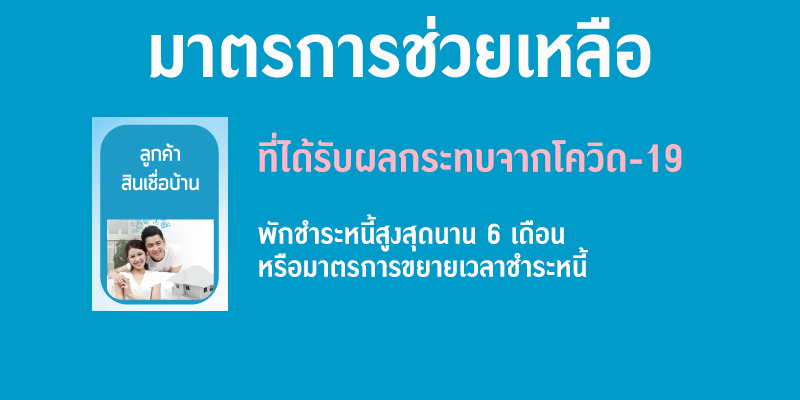 สินเชื่อบ้าน วงเงินไม่เกิน 3 ล้านบาท พักชำระเงินต้น 3 เดือน และ พิจารณาลดดอกเบี้ยให้ตามสถานการณ์ของแต่ละราย