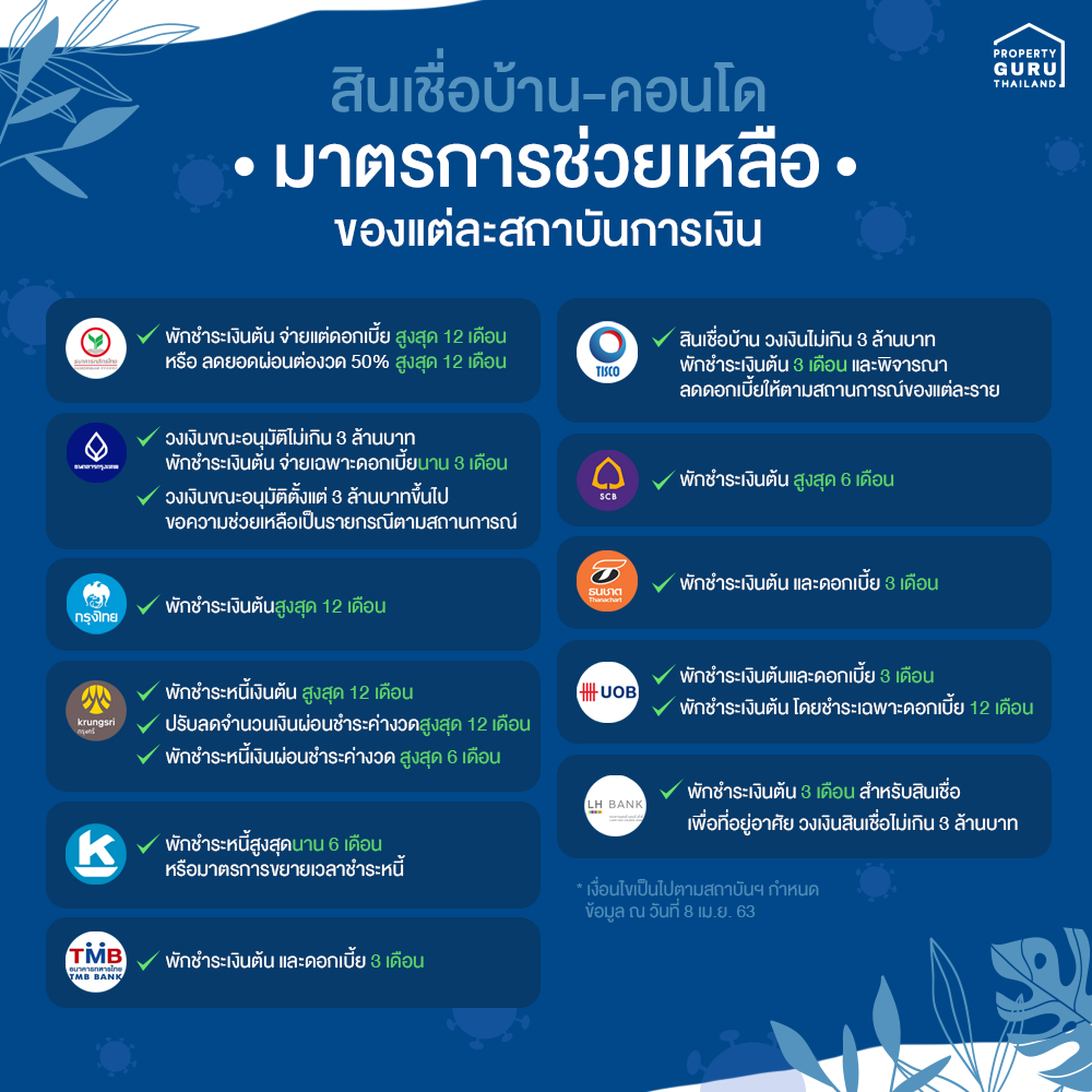 เรากำลังอยู่ในสภาวะที่เชื้อไวรัสโควิด-19 กำลังระบาดไปทั่วโลก ผู้คนต่างได้รับผลกระทบกันอย่างถ้วนหน้า ทางธนาคารแห่งประเทศไทยก็ไม่ได้นิ่งนอนใจ ออกมาตรการให้ทางสถาบันการเงินทั่วประเทศช่วยเหลือลูกหนี้ที่ได้รับผลกระทบจากสถานการณ์ที่ส่งผลกระทบต่อเศรษฐกิจไทยอย่างเช่นตอนนี้ แน่นอนว่าผู้ที่กำลังกู้ซื้อบ้าน-คอนโดตอนนี้ก็ได้รับบรรเทาภาระค่าใช้จ่ายในส่วนของหนี้สินที่เรากู้ซื้อบ้าน-คอนโดด้วยเช่นกันค่ะ เรามาดูกันว่าแต่ละสถาบันการเงินมีมาตรการช่วยเหลืออย่างไรกันบ้าง