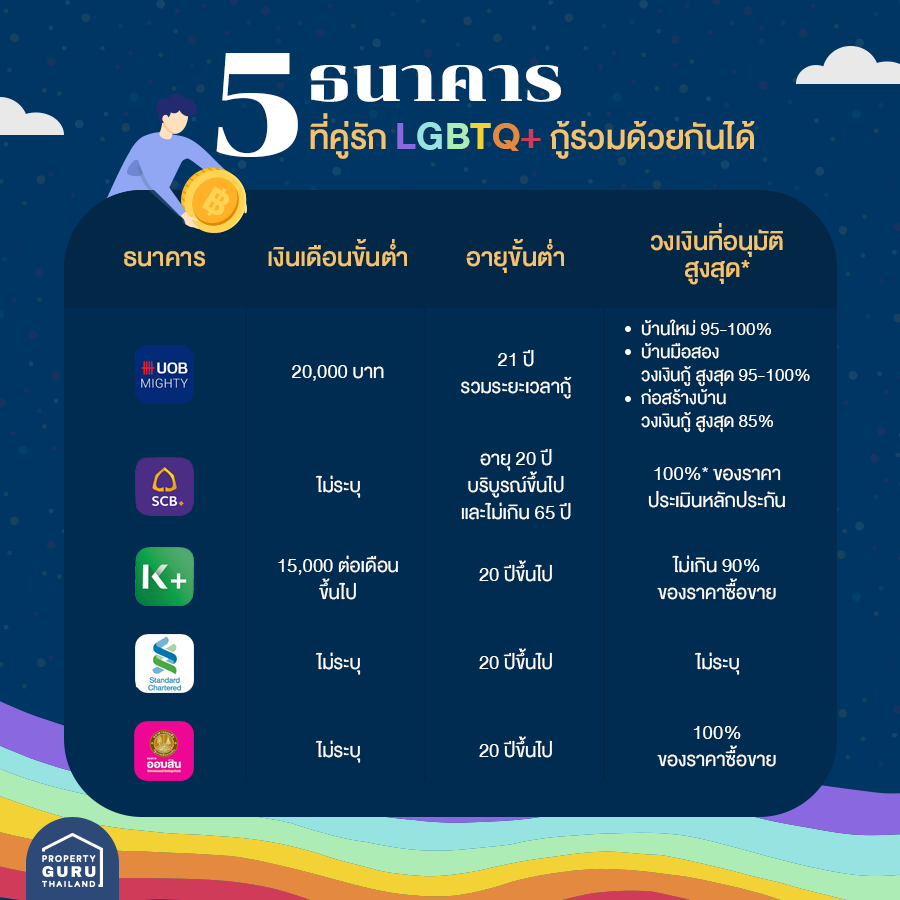 เมื่อถึงช่วงเวลาหนึ่งของชีวิต ไม่ว่าใครๆ ก็อยากจะมีความมั่นคงลงหลักปักฐานซื้อบ้านสักหลังกันใช่มั้ยคะ หากเป็นการกู้เพียงคนเดียวไม่ว่าจะเพศไหน ถ้าผ่านเกณฑ์ของธนาคารก็สามารถกู้ขอสินเชื่อได้ หากเป็นคู่รักอยากกู้ด้วยกันเพื่อที่จะได้วงเงินกู้ที่มากขึ้นและช่วยกันผ่อนก็ต้องเป็นการกู้แบบ "กู้ร่วม" ในขณะที่คู่รักชายหญิงที่จดทะเบียนสมรส มีบุตร หรือแต่งงานอยู่กินฉันสามี-ภรรยา จะสามารถกู้ร่วมกันได้ไม่มีปัญหา แต่กลุ่มหลากหลายทางเพศ (LGBTQ+) นั้นในอดีตยังมีการยกเว้นอยู่ ด้วยเหตุผลหลักๆ ต้องมีหลักฐานการสมรสนั่นก็คือ "ทะเบียนสมรส" แต่ในประเทศไทยยังไม่อนุญาตให้คู่รักเพศเดียวกันสามารถสมรสกันได้อย่างถูกต้องตามกฎหมาย ดังนั้น คู่รัก LGBTQ+ จึงไม่สามารถกู้ร่วมกันได้ แต่ แต่ แต่! ในปัจจุบันมีธนาคารที่พร้อมให้คู่รัก LGBTQ+ กู้ร่วมกันได้แล้ว ซึ่งหลักฐานที่ต้องใช้มีอะไรบ้างไปดูรายละเอียดกันเลยค่ะ