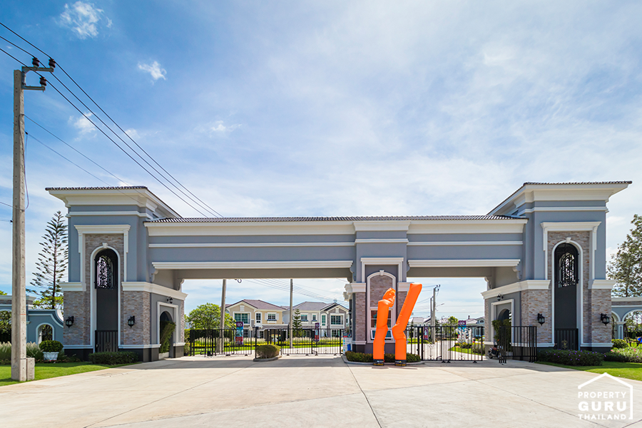ซุ้มประตูทางเข้าโครงการขนาดใหญ่ แยกทางเข้าระหว่างคนพักอาศัย และผู้มาติดต่อ