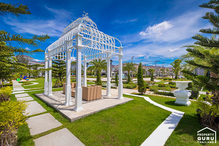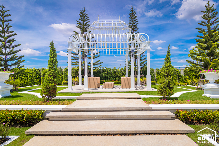ภายในสวนตกแต่งด้วยซุ้มที่นั่งสีขาวสไตล์อังกฤษ สำหรับนั่งพักผ่อน