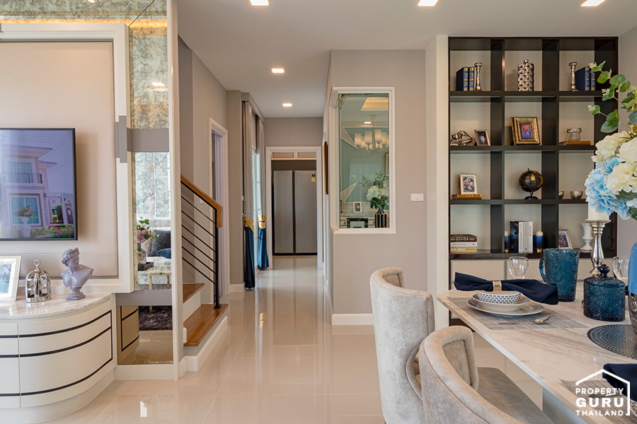 ฟังก์ชันชั้นล่างยังมี ห้องน้ำ ห้องนอนชั้นล่าง ห้องครัว และห้องซักรีด