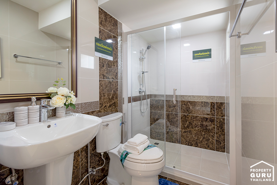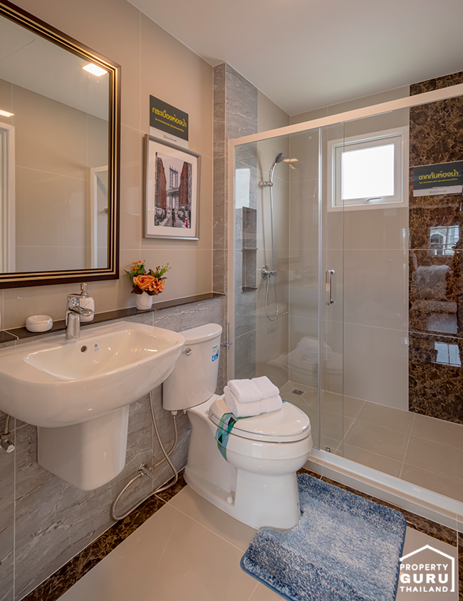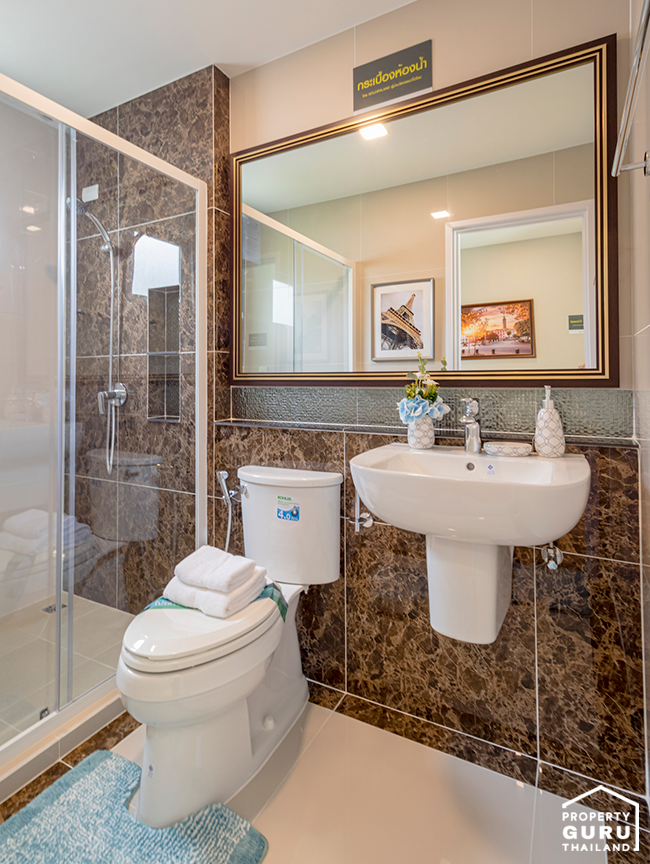 ห้องน้ำที่ให้สุขภัณฑ์ครบ พร้อมติดตั้งฉากกั้นบานเลื่อน อีกทั้งตกแต่งภายในด้วยกระเบื้องเซรามิค