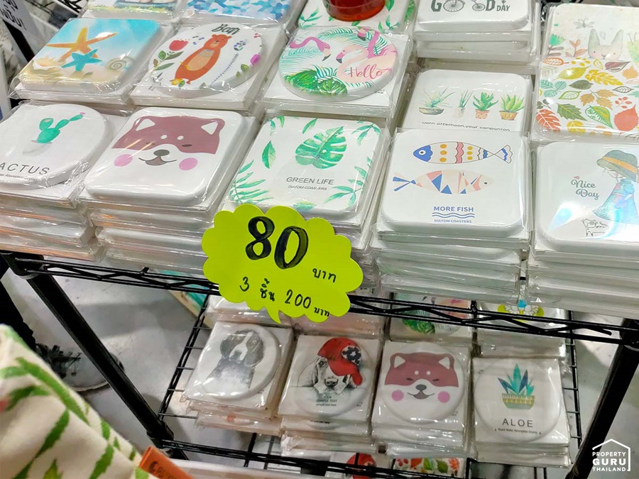 นอกจากนี้ยังมีที่รองแก้วน้ำทรงสี่เหลี่ยมซึ่งเป็นนวัตกรรมเดียวกันกับพรมหิน ราคา 80 บาท