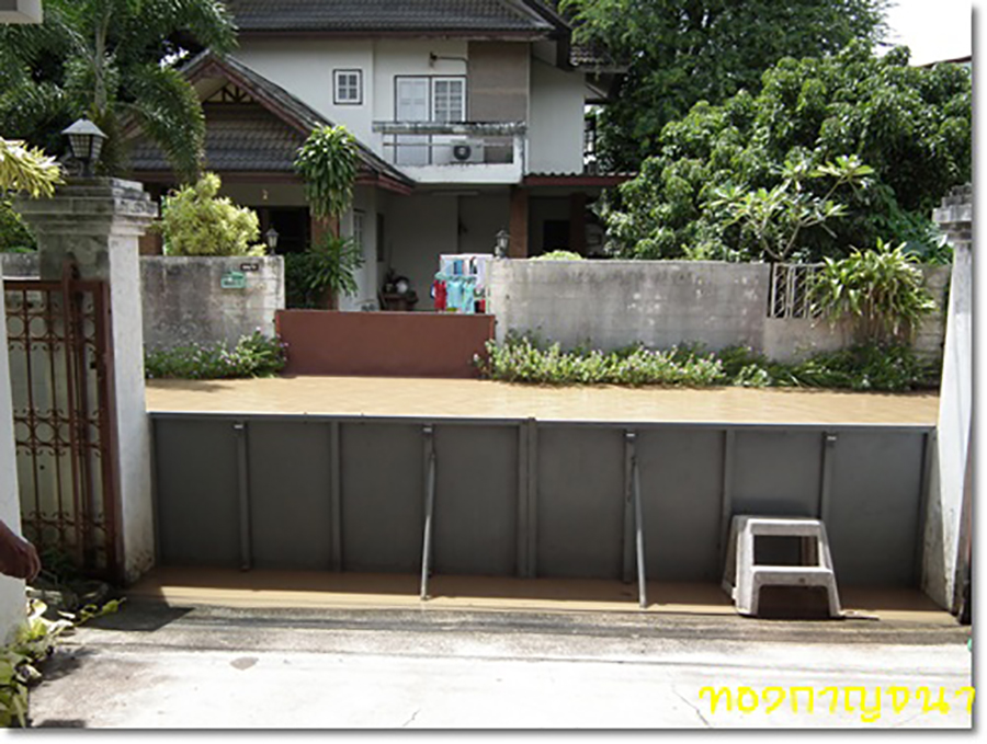 จากประสบการณ์น้ำท่วมเชียงใหม่และกระสอบทรายไม่อาจต้านทานน้ำได้ คุณทองกาญจนา (ชื่อใน www.bloggang.com) จึงได้คิดประดิษฐ์บานเหล็กกั้นน้ำ พร้อมกับใช้เครื่องสูบน้ำช่วย ทำให้น้ำไม่ทะลักเข้าไปสร้างความเสียหาย โดยอุปกรณ์ที่ใช้ก็จะมีบานเหล็กที่ออกแบบมาเฉพาะประตูบ้านและดินน้ำมัน ขั้นตอนการติดตั้งมีดังนี้